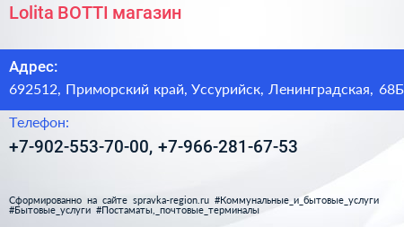 Lolita BOTTI, магазин по адресу 692512, Приморский край, Уссурийск, Ленинградская, 68Б в дальнейшем Организация, размещена в следующих категориях: