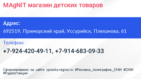MAgNIT, магазин детских товаров по адресу 692519, Приморский край, Уссурийск, Плеханова, 61 в дальнейшем Организация, размещена в следующих категориях: