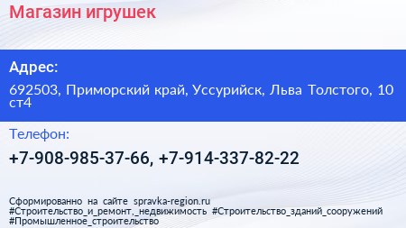Магазин игрушек по адресу 692503, Приморский край, Уссурийск, Льва Толстого, 10 ст4 в дальнейшем Организация, размещена в следующих категориях: