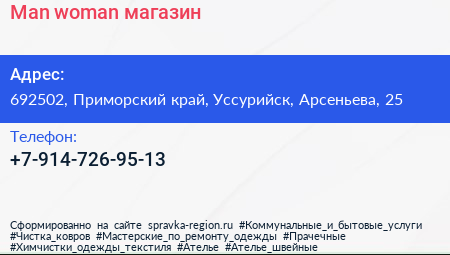 Man & woman, магазин по адресу 692502, Приморский край, Уссурийск, Арсеньева, 25 в дальнейшем Организация, размещена в следующих категориях: