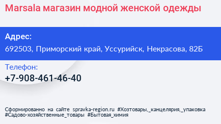 Marsala, магазин модной женской одежды по адресу 692503, Приморский край, Уссурийск, Некрасова, 82Б в дальнейшем Организация, размещена в следующих категориях: