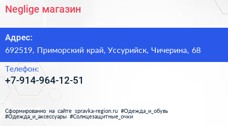 Neglige, магазин по адресу 692519, Приморский край, Уссурийск, Чичерина, 68 в дальнейшем Организация, размещена в следующих категориях: