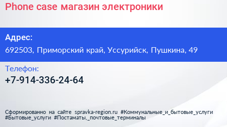 Phone case, магазин электроники по адресу 692503, Приморский край, Уссурийск, Пушкина, 49 в дальнейшем Организация, размещена в следующих категориях: