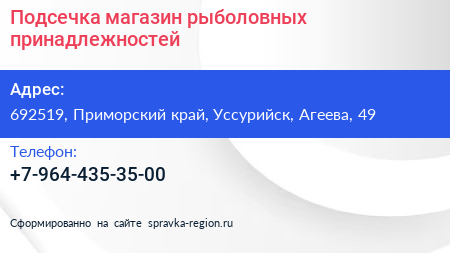 Подсечка, магазин рыболовных принадлежностей по адресу 692519, Приморский край, Уссурийск, Агеева, 49 в дальнейшем Организация, размещена в следующих категориях: