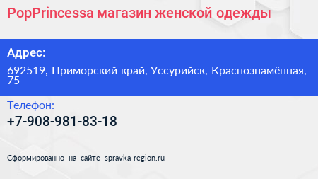 PopPrincessa, магазин женской одежды по адресу 692519, Приморский край, Уссурийск, Краснознамённая, 75 в дальнейшем Организация, размещена в следующих категориях:
