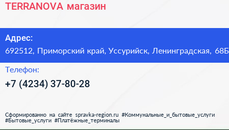 TERRANOVA, магазин по адресу 692512, Приморский край, Уссурийск, Ленинградская, 68Б в дальнейшем Организация, размещена в следующих категориях: