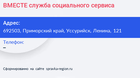 ВМЕСТЕ, служба социального сервиса по адресу 692503, Приморский край, Уссурийск, Ленина, 121 в дальнейшем Организация, размещена в следующих категориях: