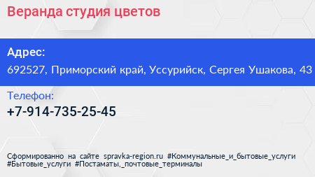 Веранда, студия цветов по адресу 692527, Приморский край, Уссурийск, Сергея Ушакова, 43 в дальнейшем Организация, размещена в следующих категориях: