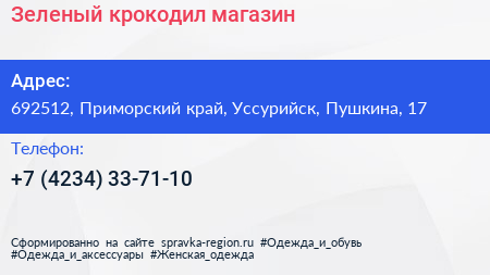 Зеленый крокодил, магазин по адресу 692512, Приморский край, Уссурийск, Пушкина, 17 в дальнейшем Организация, размещена в следующих категориях: