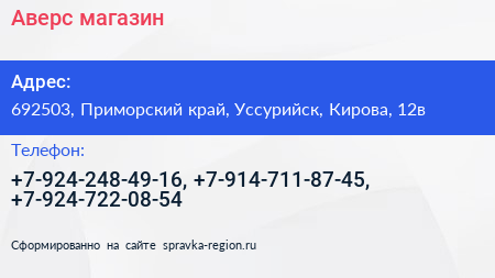 Аверс, магазин по адресу 692503, Приморский край, Уссурийск, Кирова, 12в в дальнейшем Организация, размещена в следующих категориях: