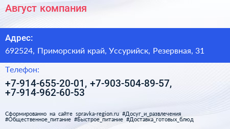 Август, компания по адресу 692524, Приморский край, Уссурийск, Резервная, 31 в дальнейшем Организация, размещена в следующих категориях: