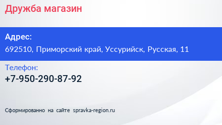 Дружба, магазин по адресу 692510, Приморский край, Уссурийск, Русская, 11 в дальнейшем Организация, размещена в следующих категориях:
