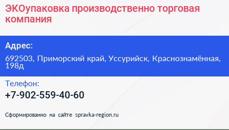 ЭКОупаковка, производственно-торговая компания по адресу 692503, Приморский край, Уссурийск, Краснознамённая, 198д в дальнейшем Организация, размещена в следующих категориях: