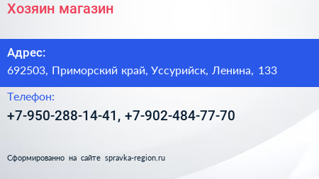 Хозяин, магазин по адресу 692503, Приморский край, Уссурийск, Ленина, 133 в дальнейшем Организация, размещена в следующих категориях: