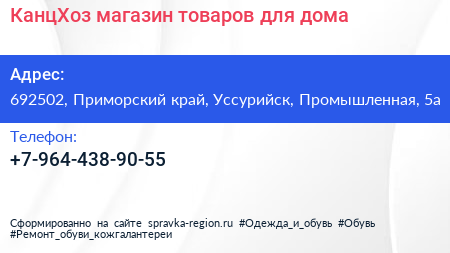 КанцХоз, магазин товаров для дома по адресу 692502, Приморский край, Уссурийск, Промышленная, 5а в дальнейшем Организация, размещена в следующих категориях: