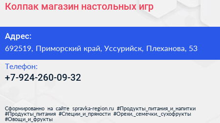 Колпак, магазин настольных игр по адресу 692519, Приморский край, Уссурийск, Плеханова, 53 в дальнейшем Организация, размещена в следующих категориях: