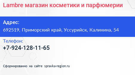 Lambre, магазин косметики и парфюмерии по адресу 692519, Приморский край, Уссурийск, Калинина, 54 в дальнейшем Организация, размещена в следующих категориях: