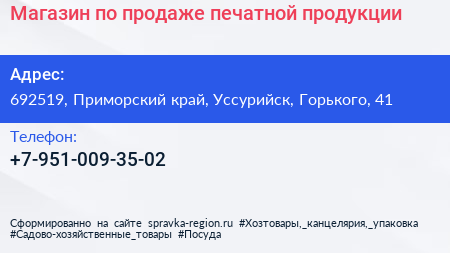 Магазин по продаже печатной продукции по адресу 692519, Приморский край, Уссурийск, Горького, 41 в дальнейшем Организация, размещена в следующих категориях: