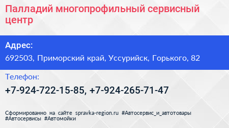 Палладий, многопрофильный сервисный центр по адресу 692503, Приморский край, Уссурийск, Горького, 82 в дальнейшем Организация, размещена в следующих категориях: