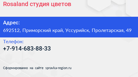 Rosaland, студия цветов по адресу 692512, Приморский край, Уссурийск, Пролетарская, 49 в дальнейшем Организация, размещена в следующих категориях: