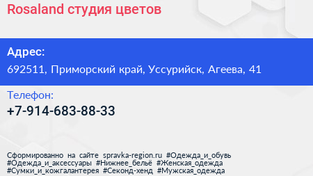 Rosaland, студия цветов по адресу 692511, Приморский край, Уссурийск, Агеева, 41 в дальнейшем Организация, размещена в следующих категориях: