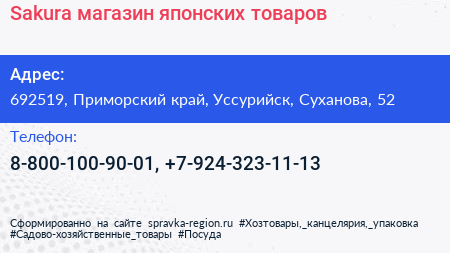 Sakura, магазин японских товаров по адресу 692519, Приморский край, Уссурийск, Суханова, 52 в дальнейшем Организация, размещена в следующих категориях: