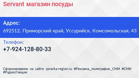 Servant, магазин посуды по адресу 692512, Приморский край, Уссурийск, Комсомольская, 43 в дальнейшем Организация, размещена в следующих категориях: