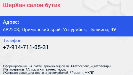 ШерХан, салон-бутик по адресу 692503, Приморский край, Уссурийск, Пушкина, 49 в дальнейшем Организация, размещена в следующих категориях: