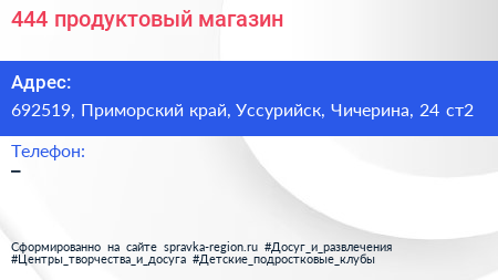 444, продуктовый магазин по адресу 692519, Приморский край, Уссурийск, Чичерина, 24 ст2 в дальнейшем Организация, размещена в следующих категориях: