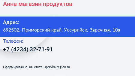 Анна, магазин продуктов по адресу 692502, Приморский край, Уссурийск, Заречная, 10а в дальнейшем Организация, размещена в следующих категориях: