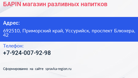 БАРIN, магазин разливных напитков по адресу 692510, Приморский край, Уссурийск, проспект Блюхера, 42 в дальнейшем Организация, размещена в следующих категориях: