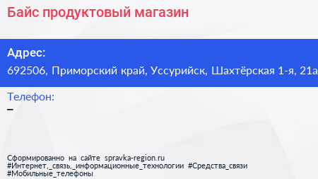 Байс, продуктовый магазин по адресу 692506, Приморский край, Уссурийск, Шахтёрская 1-я, 21а в дальнейшем Организация, размещена в следующих категориях: