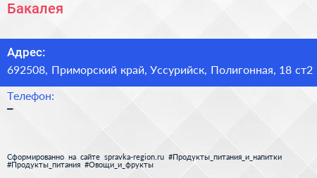 Бакалея по адресу 692508, Приморский край, Уссурийск, Полигонная, 18 ст2 в дальнейшем Организация, размещена в следующих категориях: