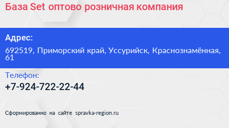 База Set, оптово-розничная компания по адресу 692519, Приморский край, Уссурийск, Краснознамённая, 61 в дальнейшем Организация, размещена в следующих категориях: