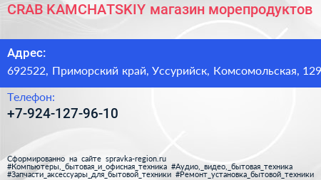 CRAB KAMCHATSKIY, магазин морепродуктов по адресу 692522, Приморский край, Уссурийск, Комсомольская, 129 в дальнейшем Организация, размещена в следующих категориях: