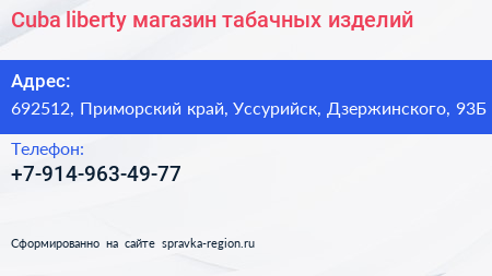 Cuba liberty, магазин табачных изделий по адресу 692512, Приморский край, Уссурийск, Дзержинского, 93Б в дальнейшем Организация, размещена в следующих категориях: