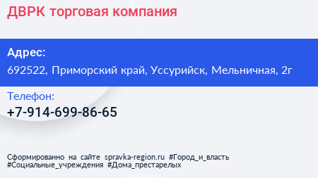 ДВРК, торговая компания по адресу 692522, Приморский край, Уссурийск, Мельничная, 2г в дальнейшем Организация, размещена в следующих категориях: