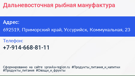 Дальневосточная рыбная мануфактура по адресу 692519, Приморский край, Уссурийск, Коммунальная, 23 в дальнейшем Организация, размещена в следующих категориях:
