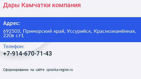 Дары Камчатки, компания по адресу 692503, Приморский край, Уссурийск, Краснознамённая, 220в ст1 в дальнейшем Организация, размещена в следующих категориях: