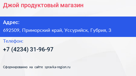 Джой, продуктовый магазин по адресу 692509, Приморский край, Уссурийск, Губрия, 3 в дальнейшем Организация, размещена в следующих категориях: