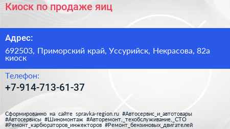 Киоск по продаже яиц по адресу 692503, Приморский край, Уссурийск, Некрасова, 82а киоск в дальнейшем Организация, размещена в следующих категориях: