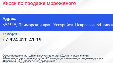 Киоск по продаже мороженого по адресу 692519, Приморский край, Уссурийск, Некрасова, 64 киоск в дальнейшем Организация, размещена в следующих категориях: