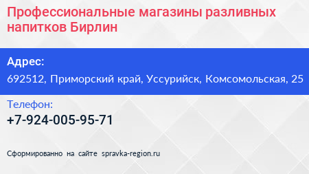 Профессиональные магазины разливных напитков Бирлин по адресу 692512, Приморский край, Уссурийск, Комсомольская, 25 в дальнейшем Организация, размещена в следующих категориях:
