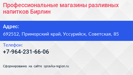 Профессиональные магазины разливных напитков Бирлин по адресу 692512, Приморский край, Уссурийск, Советская, 85 в дальнейшем Организация, размещена в следующих категориях: