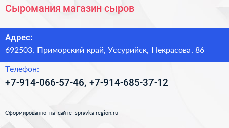 Сыромания, магазин сыров по адресу 692503, Приморский край, Уссурийск, Некрасова, 86 в дальнейшем Организация, размещена в следующих категориях: