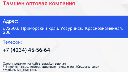 Тамшен, оптовая компания по адресу 692503, Приморский край, Уссурийск, Краснознамённая, 238 в дальнейшем Организация, размещена в следующих категориях: