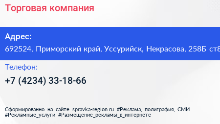 Торговая компания по адресу 692524, Приморский край, Уссурийск, Некрасова, 258Б ст8 в дальнейшем Организация, размещена в следующих категориях: