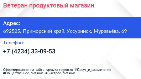 Ветеран, продуктовый магазин по адресу 692525, Приморский край, Уссурийск, Муравьёва, 69 в дальнейшем Организация, размещена в следующих категориях: