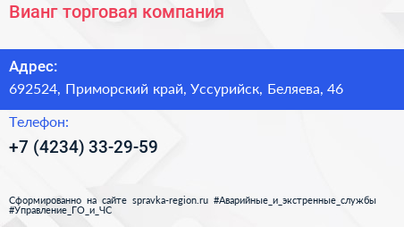 Вианг, торговая компания по адресу 692524, Приморский край, Уссурийск, Беляева, 46 в дальнейшем Организация, размещена в следующих категориях: