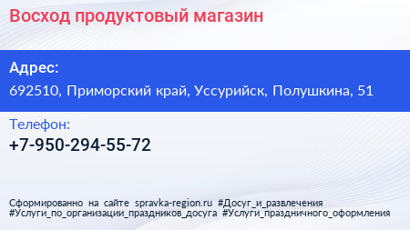 Восход, продуктовый магазин по адресу 692510, Приморский край, Уссурийск, Полушкина, 51 в дальнейшем Организация, размещена в следующих категориях:
